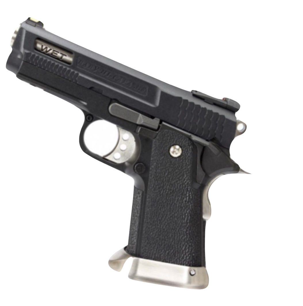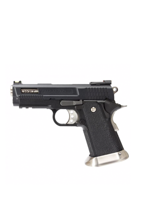 WE HI-CAPA 3.8 Brontosaurus GBB Pistol. BLACK vented Slide. BLACK frame with custom stippling. SILVER Barrel with .45 ACP engraving on the chamber.